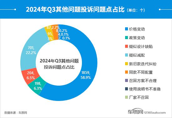 第三季度,尽管“价格波动”仍然是一家独大,但其投诉问题数量和比例持续大幅下降。值得注意的是,“疑似减配”如雨后春笋般涌现,投诉数量环比增长超过。 2 倍数,比例提高 17.5 %,超过总数 1/5。根据车质网的数据,“疑似减配”主要集中在部分自主和日系品牌车型上。以奇瑞瑞虎 9 例如,一些车主报告说,购买的车型已经减少了mm波雷达,导致辅助驾驶功能受到限制,不仅影响了日常使用,还存在安全隐患。截至发稿时,仍有大量车主未能得到厂家的妥善处理。