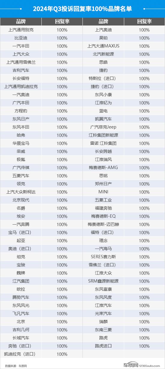 第三季度投诉回复率达到 100% 的品牌共有 81 与上季度相比,家庭下降了 4 与去年同期相比,家庭的数量增加了。 9 家庭。其中,自有品牌的比例接近 6 成功,对客户诉求的积极态度和重视程度要优于合资和进口品牌。