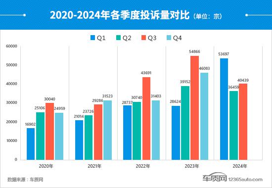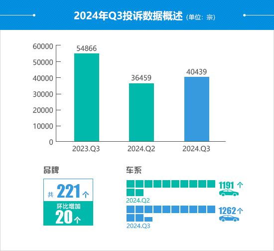 2024 2008年第三季度,汽车质量网共同接受消费者对汽车产品的有效投诉 40,439 宗(包括第三方平台和后装轮胎投诉) 44 宗),环比增长 同比下降10.9% 26.3%。根据汽车质量网络数据分析,本季度共受理 221 一个汽车品牌和 1,262 与上季度相比,一款车型有所增强。 20 个品牌和 71 个车型。
