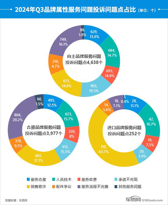 自主、合资、进口品牌投诉问题在第三季度品牌属性服务问题投诉中所占比例均有所增加。在这些品牌中,进口品牌涨幅最大,环比增长 69.1%。从比例来看,承诺不兑现替代服务流程的不完善已经成为自有品牌比例最高的服务问题,投诉点集中在“销售承诺不兑现”上。在进口品牌中,二季度销售欺诈的投诉数量和比例大幅增加。在这些比例中,比例增加 20.9 %,已经成为进口品牌比例最高的服务问题,已经超过了总数。 4 成。