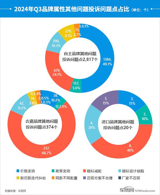 自主品牌投诉问题点在第二季度品牌属性投诉问题中所占比例不断下降,较第二季度有所下降。 38.2%,“价格波动”仍然是其比例最高的问题。相比之下,合资品牌的投诉问题略有提高,“疑似减配”成为投诉高发区,比例跃升至第一位,较第二季度有所提升。 63.5 %,与部分日系 SUV 车型相关。