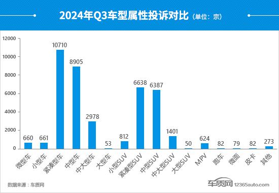2、该季度,2024 汽车成为投诉的焦点,总投诉突破 5,000 宗,刷新了季度投诉的最高记录,自主和德国品牌是投诉的主要来源,两者的比例之和超过了总数。 8 成。通过具体分析可以发现,2024 汽车的投诉类型仍然主要是简单的质量问题,投诉数量超过 2,000 宗,占总数的一半以上,投诉故障集中在“影音系统故障”上。、“驾驶辅助系统故障”和“空调问题”。在 2024 在汽车投诉中,燃油车和插电式混合动力汽车是投诉量最集中的能源类型,后者环比增速超过 1.3 倍数,投诉增量来自部分自主品牌车型。此外,中型 SUV、中型车和紧凑型车 SUV 变成 2024 车辆中投诉占比最高的三种车型特性,占比之和一半以上。其中,中型 SUV 投诉数量超过千宗,环比增长超过千宗。 1.6 倍。