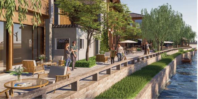 沿河界面塑造:沿河界面开启,局部选择架空灰空间,形成沿河商业面。今后还将结合水上活动,营造丰富的滨水商业和活动空间。