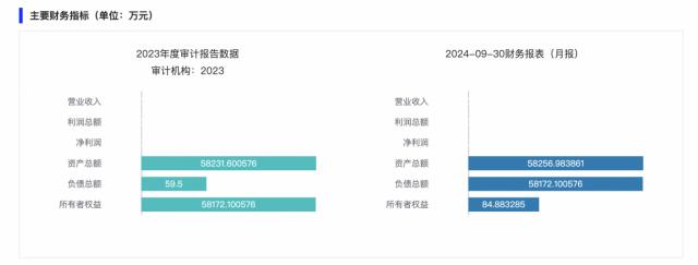 财务资料显示,河南中乐地产 2023 到目前为止,没有营业收入,净利润。到目前为止 2023 年 12 月末,河南中乐地产总资产 5.82 负债总额为亿元 59.5 万元。截至 2024 年 9 月末,河南中乐地产总资产为 5.83 负债总额为亿元为 5.82 亿元。