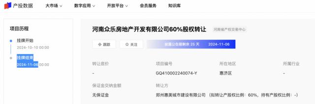 乐居财经 刘治颖 10 月 10 日本,河南中乐房地产开发有限公司(以下简称河南中乐房地产)60% 股份转让挂牌转让,转让方为郑州惠美城市建设有限公司(以下简称郑州惠美城市建设),挂牌结束日期为 2024-11-06。
