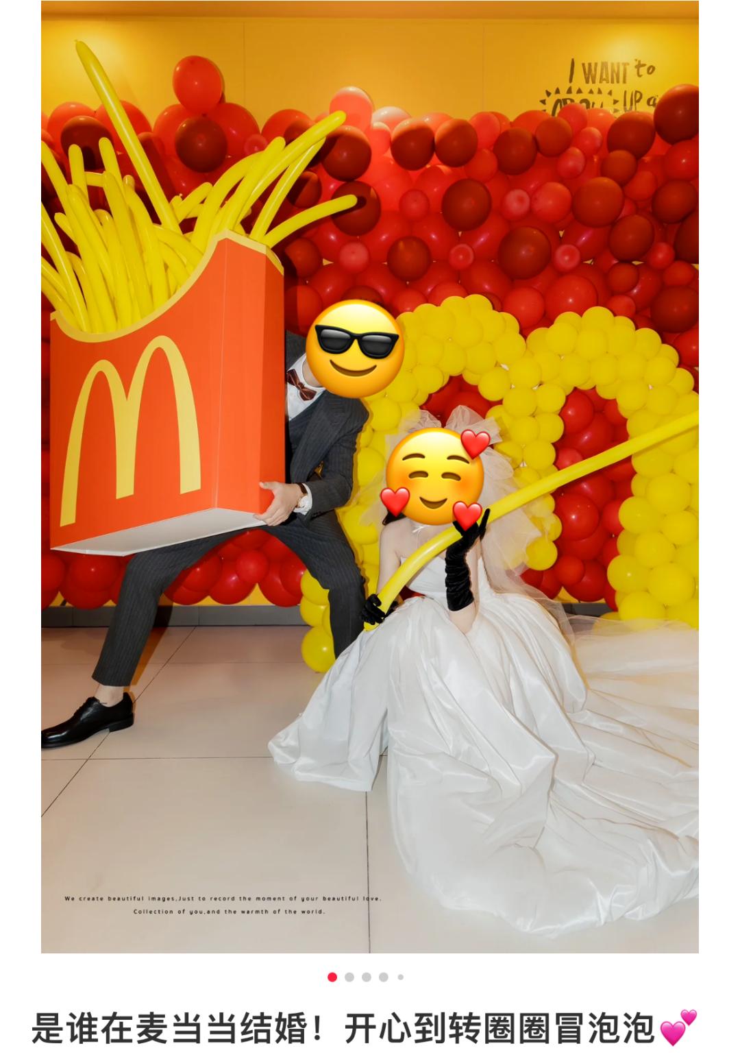 有人在麦当劳或肯德基包了一整层儿童公园。“结婚那天,你要吃自己喜欢的麦门,用可乐代替酒。没有人会在现场喝醉,你可以把麦乐鸡块绑成婚礼花束。纯真瞬间上升。”