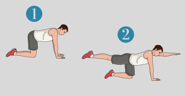鸟狗式:能安全可靠地锻炼腰背肌,增强肌肉力量。第一,屈髋屈膝 90 跪在垫子上,双手同肩支撑地面。抬起左上肢,向前伸直,直到与身体对齐;同时,伸直右腿和右脚,向后抬起,直到与身体对齐。保持这个姿势 2-3 秒,然后慢慢回到最初的跪姿。然后用右上肢和右腿重复上述动作,两侧替换反复练习。 10 次。