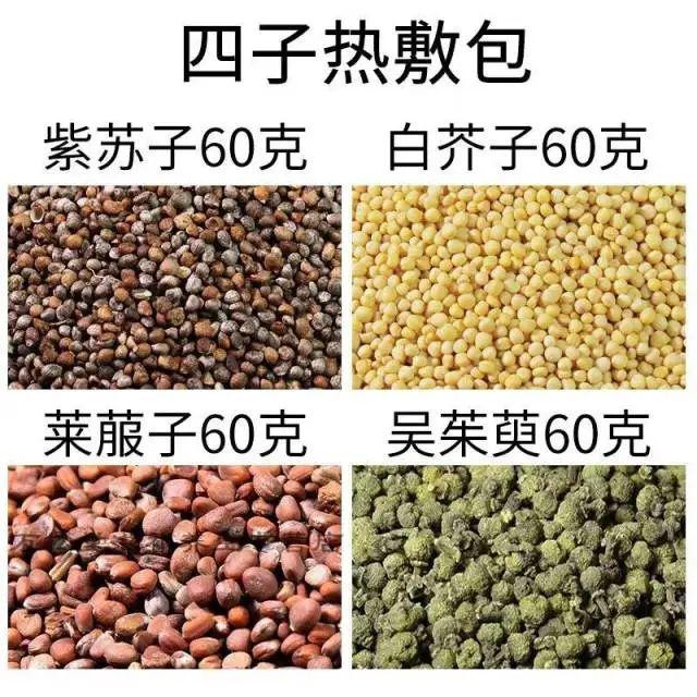 中药紫苏子 60g、白芥子 60g、莱菔子 60g、吴茱萸 60g,与小布袋混合,微波炉加热。 2-3 外用于腰背部分分钟 15-20 分钟,每天 1-2 第二,配合按摩手法,可以起到温经散寒、舒筋活血、通脉止痛的作用,而且材料方便,制作简单,适合日常保健。