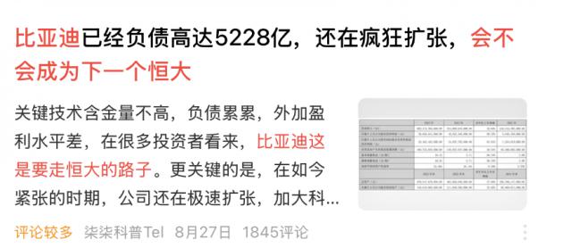 在讨论比亚迪是否会成为下一个恒大的同时,原因是债务。 5000 十亿,现金流量下降 80%;