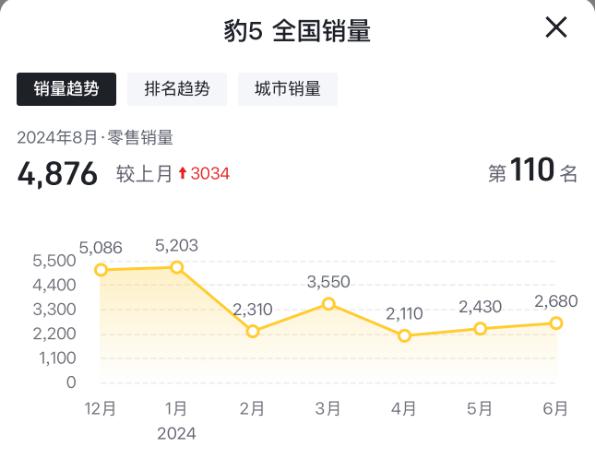 方程豹豹 5、上市之初有一个小小的高光时刻,但随后销量稳定在一定程度上。 2000 多辆。7 月底,豹子 5 狂降 5 万、以价换量,8 月销量立即上升至一个月。 4800 辆。