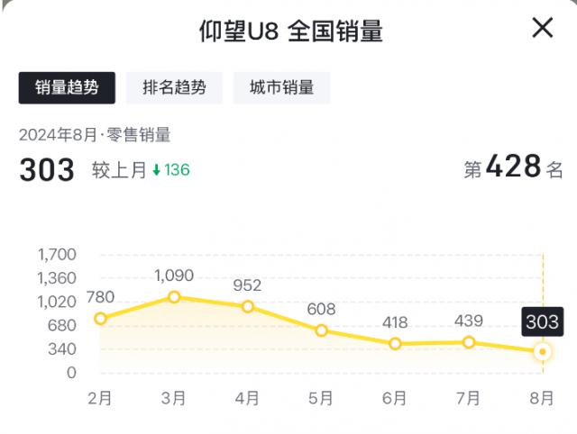 上市之初,月销一度超过千台,但月销过千后,就是一路下滑,直到一路下滑, 8 月份就还剩 300 多台了。