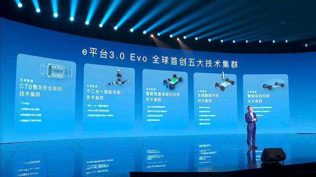 全新一代 e 平台 3.0 Evo 汇集了 CTB 全球五大首创技术集群,包括全车安全架构、十二合一智能电驱动、智能宽温域高效热泵、全球智能快充和智能运动控制。
