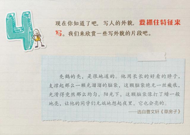 第四步:综上所述,写人的外表需要把握特点。然后我们举一反三。在我们之前读过的书中,写人物特征的片段是用来阅读的。