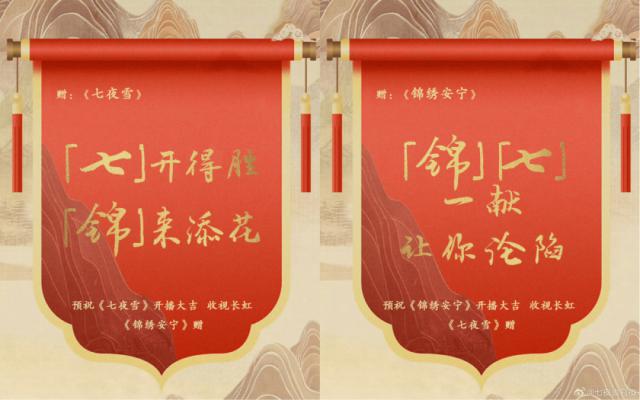 就在这两天,华策克顿集团旗下公司出品的两部古偶《七夜雪》和《锦绣安宁》连续播出,两部剧在官方微博上互祝播出好运。