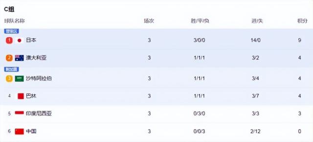 前三轮结束后,C 整体积分榜:日本队 9 分数领先,澳大利亚在这一轮对中国队的首场比赛中取得了胜利 4 分数排在第二位,沙特队同积 4 得分以净胜球排名第三,巴林队也是第三, 4 排名第四,印尼队 3 场平手拿到 3 中国队排名第五 3 战全败 0 分垫底。
