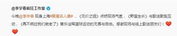 值得注意的是,李宇春工作室在社交平台上发布了一条消息:“今晚,李宇春出现在上海聚星名人大赛上,《无价之姐》点燃了现场氛围,《野蛮成长》与粉丝默契互动。音乐《如果我们不疯狂,我们就会变老》诠释了篮球的无畏和自由。感谢现场和线上粉丝朋友们!”