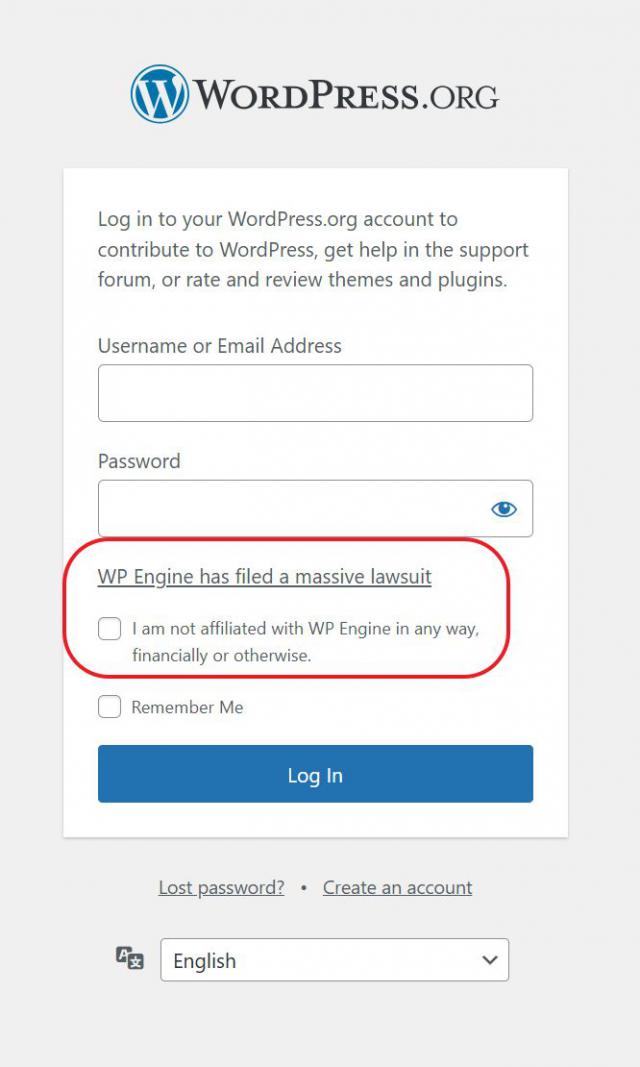报道称 WordPress.org 使用者必须确定他们和他们,然后才能注册新账户或登录。 WP Engine "在任何方面,包括财务方面都没有任何关系",不检查该选项的客户不能登录或注册新账户。