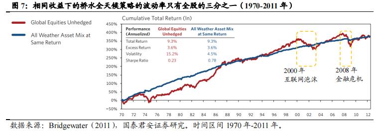根据桥水在《Risk Parity Is About Balance》(2011)在目标收益一致的前提下,1970-2011年全天候模型投资组合的波动性为。 同期全球股指波动为15.2%的4.5%,这意味着全天候模型下投资组合的波动不如全球股指波动。 1/3[1]。