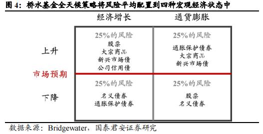 首先,达里奥根据经济增长指标、通货膨胀指标的实际价值和市场预期价值之间的关系,分为四种宏观经济状态。其次,在不同的象限中找出每一类表现良好的资产,然后通过杠杆机制调整不同资产的风险收益特征,然后将风险权重平等配置,形成最终的匹配。