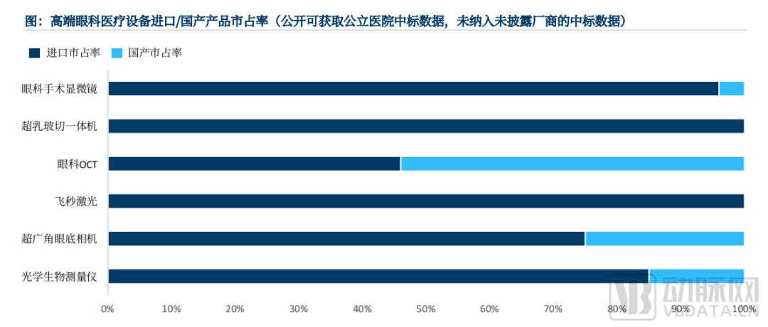 但在供给方面,我国眼科医疗器械领域长期存在较高的进口垄断率。比如在眼科医疗器械方向,根据2021年动脉网的调查,根据销售额计算,当时进口眼科设备供应商的市场份额高达98%,即使按销量计算,这个比例也达到了90%以上。