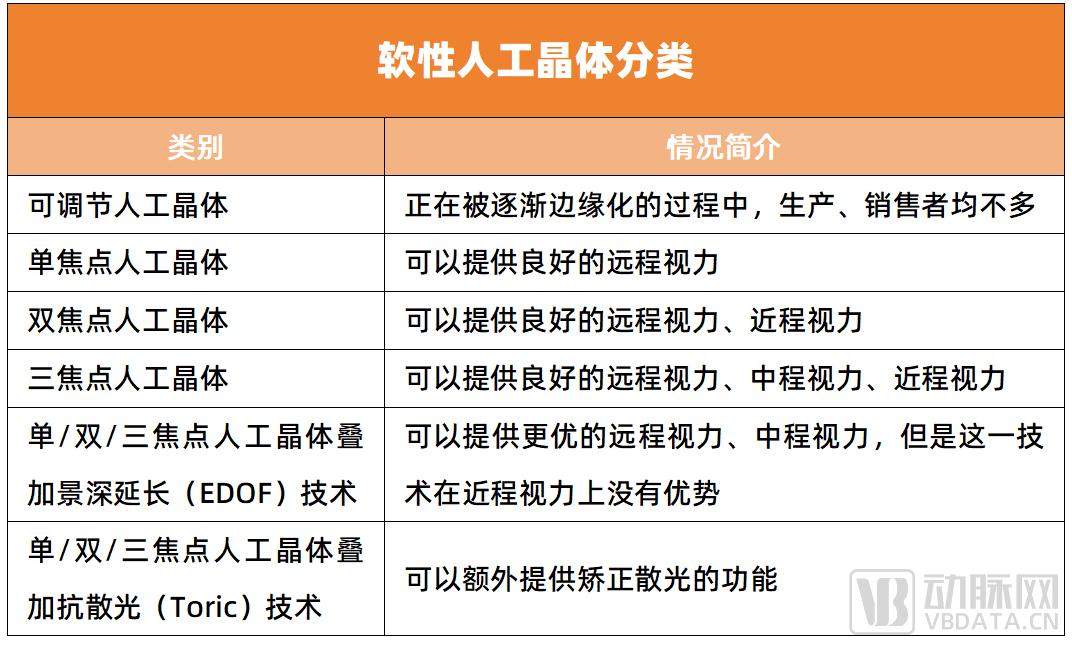 目前常见的柔性人工晶体可分为单焦点人工晶体、双焦点人工晶体、三焦点人工晶体、人工晶体叠加景深增加技术、人工晶体叠加抗散光技术。其中,单焦点晶体只能满足晶状体不再浑浊的问题,但无法解决患者常见的近视、远视或老花眼问题,而双焦点和三焦点可以为患者提供更多的视程。