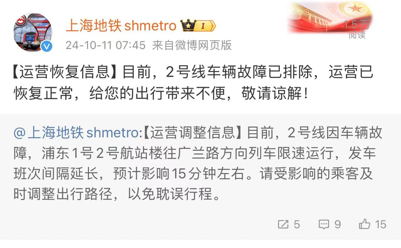7点45分,@上海地铁shmetro 发布恢复操作信息:目前,2号线车辆故障已经排除,操作已经恢复正常,给您的出行带来不便,敬请谅解!