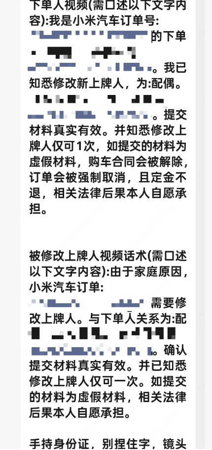 记者从另一头黄牛那里了解到,目前小米的SU7转账大部分都是通过做假证来证明亲属关系,从而实现转账。比如P结婚证是原车主的夫妻,P户口本证明是原车主的父母子女。如果操作快,一个小时就能完成转账。但是现在转账的审批越来越严格了。视频审核的时候,要亲自读出承担责任的条款。