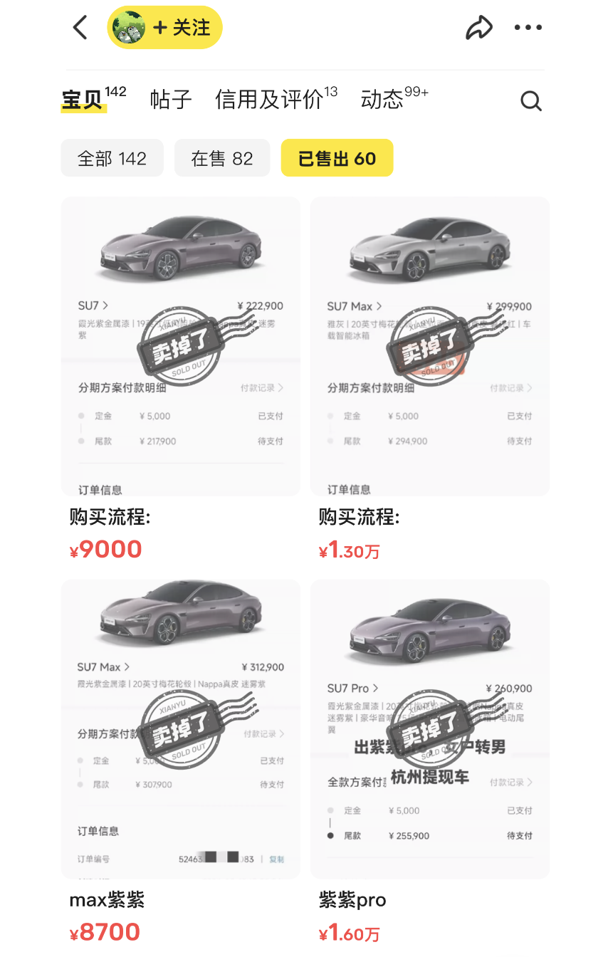 闲鱼也可以买小米SU7,也是新车,最早两个星期就能拿到车。看似方便的交易背后,其实隐藏着一个巨大的灰色行业的转单交易。