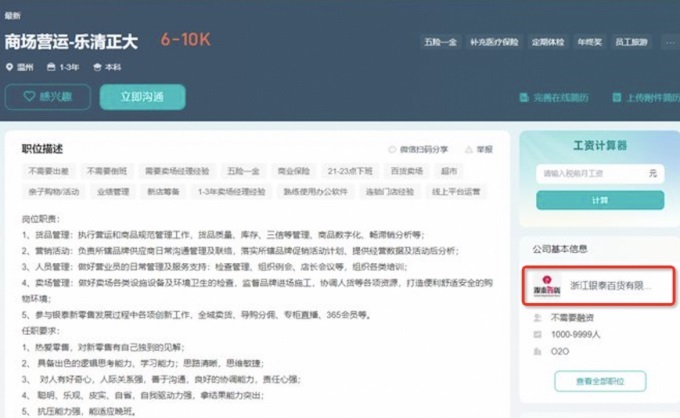搜索发现,岗位招聘信息已经挂在招聘网站上,信息是银泰百货(阿里银泰)发布的。从这个角度来看,银泰百货运营团队正式进入的概率很大。