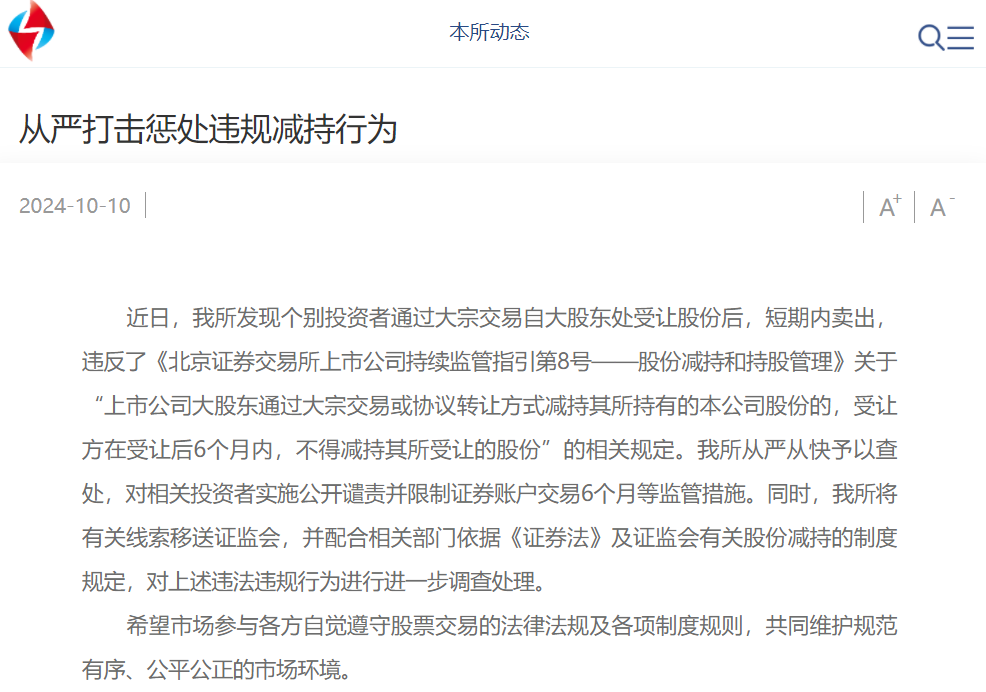 今天,北京证券交易所宣布,近日,北京证券交易所发现个别投资者通过大宗交易从大股东处转让股份后,短期内出售股份,违反了《北京证券交易所上市公司持续控制指引第8号-股份减持和持股管理》关于“上市公司大股东通过大宗交易或协议转让减持公司股份的,买方不得在转让后6个月内减持其转让的股份”的相关规定。