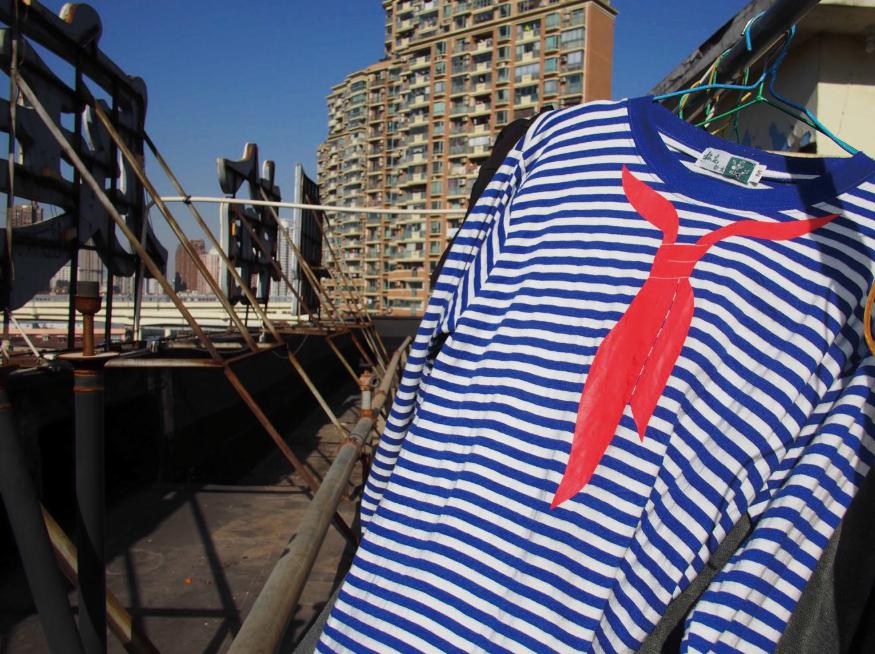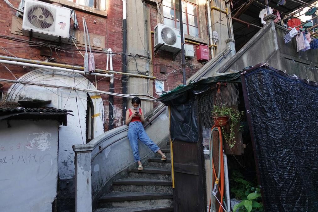 话说回来,你越是花更多的时间审视陆元敏的每一部作品,你就会惊讶地发现,那些颜色的悬挂突破了混乱的重围,形成了一种特殊的满足感:游乐园里的大广告牌,水槽旁边的红色肥皂,桌子旁边五颜六色的瓶子和罐子(这张图的曝光控制极其“专业”),凌乱的电线中出现了一个空荡荡的鸟笼,展厅里的女性红色露背连衣裙和男性蓝色连衣裙相得益彰。尤其是石库门建筑走廊下杂乱无章的女孩的红色背心,让人感到莫名的欲望...所以,在陆元敏目前的实践中,色彩并不是一种自由可有可无的点缀?