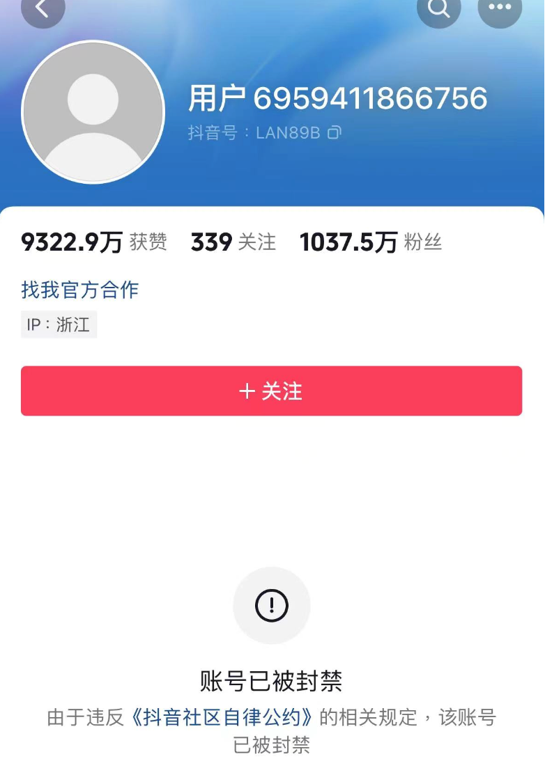 现在,“大蓝”原账号首页显示:“由于违反了《抖音社区自律公约》的有关规定,该账号已经被封禁。