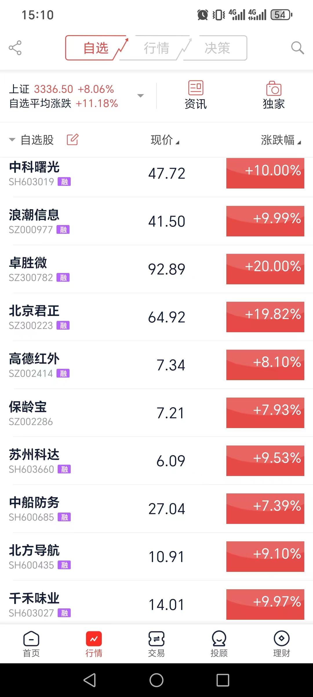 最后,股票交易软件刷新了当天的市场前景,红通一片,三大股指集体大幅高开。上证指数、深证指数、创业板指数分别高开10.13%。、12.67%、近千只股票涨停18.44%,开盘后仅20分钟,沪深股市成交额突破1万亿元,全天成交额达到34519.39亿元。一系列历史新纪录在一天内诞生,如市场开盘最大涨幅、破万亿最快成交记录、单日最高成交额、创业板指数等。
