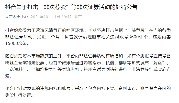 10月11日晚,Tiktok安全中心发布《关于打击“非法推荐股票”等非法证券活动的处罚公告》。Tiktok表示,最近一个月,股市违规账户3600多个,违规内容1.5万多个。