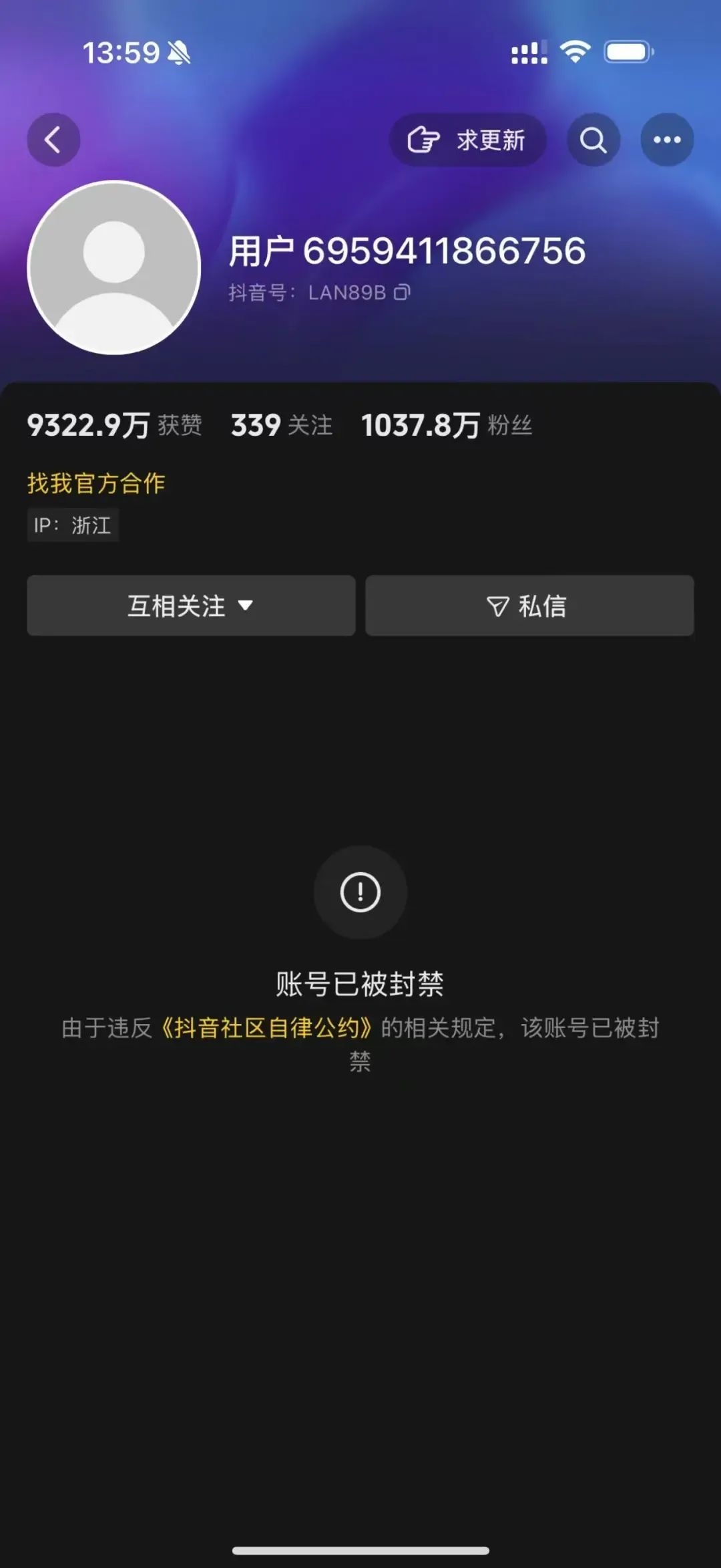 十月十一日,有媒体报道,千万粉丝财经博主“大蓝”被抖音平台封号。现在,“大蓝”原账号首页显示:“由于违反了《抖音社区自律公约》的有关规定,该账号已经被封禁。