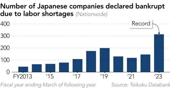 截至今年3月的12个月,由于劳动力短缺,日本已有313家公司破产,比上年翻了一番。