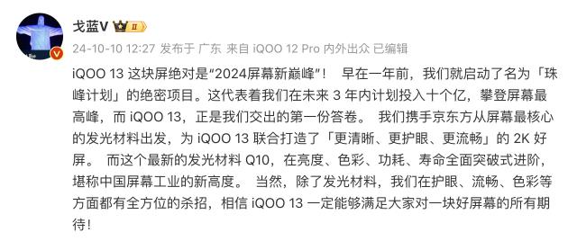 十月初,各手机厂商的旗舰产品都进入了预热阶段,其中备受关注。 iQOO 新的数字旗舰产品 iQOO 今天也出现了13 2024 vivo 开发者大会现场。iQOO 13 第一批将搭载全新的 OriginOS 5 系统,剑指“性能流畅的第一”。值得注意的是,iQOO 13 今天也曝光了真机正面屏幕,并正式宣布全球首发。 BOE 最新 Q10 光学材料,有望成为" 2024 新的屏幕巅峰”。