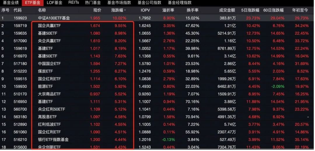 收盘后,红利ETF领涨市场,安全国企双赢ETF罕见涨停,华夏中证基建50ETF、ETF是国泰央企的双赢、ETF等国泰中证基础设施涨幅超过8%。