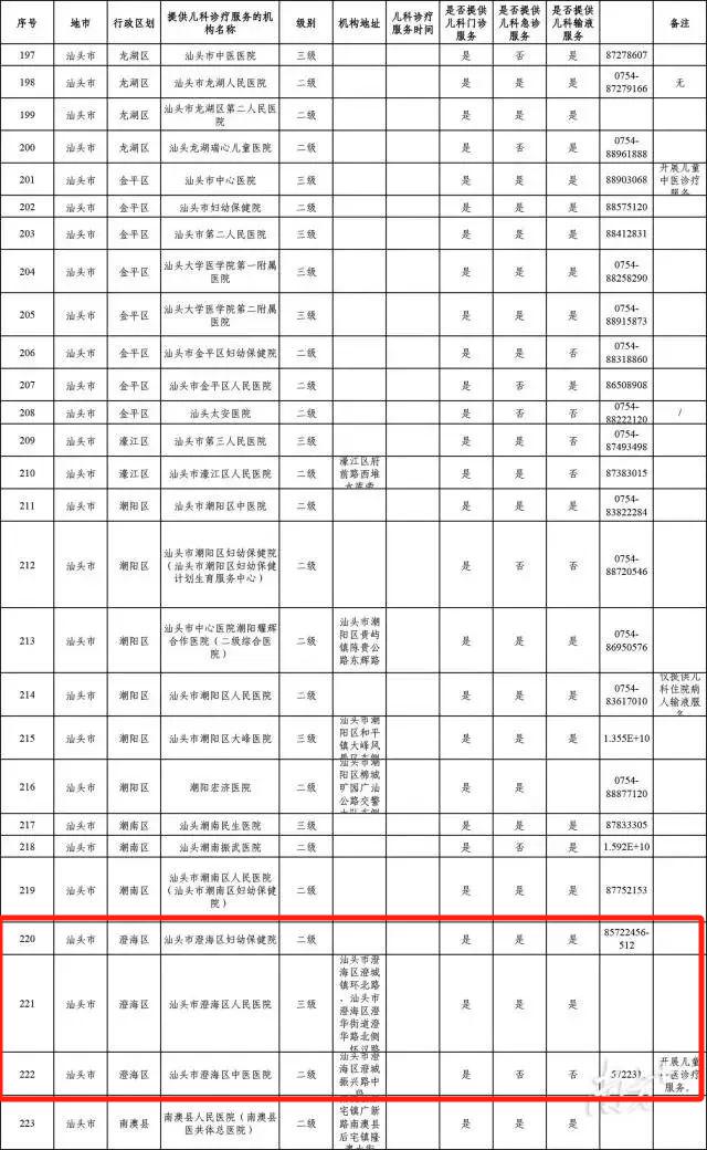 11 月 24 日本,广东省卫生健康委公布全省提供医疗机构提供儿科诊疗服务名单,其中,汕头市有 27 家,我区有 3 家。