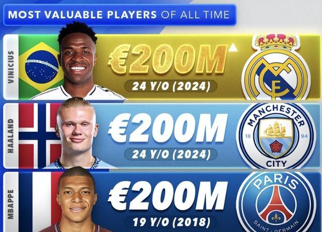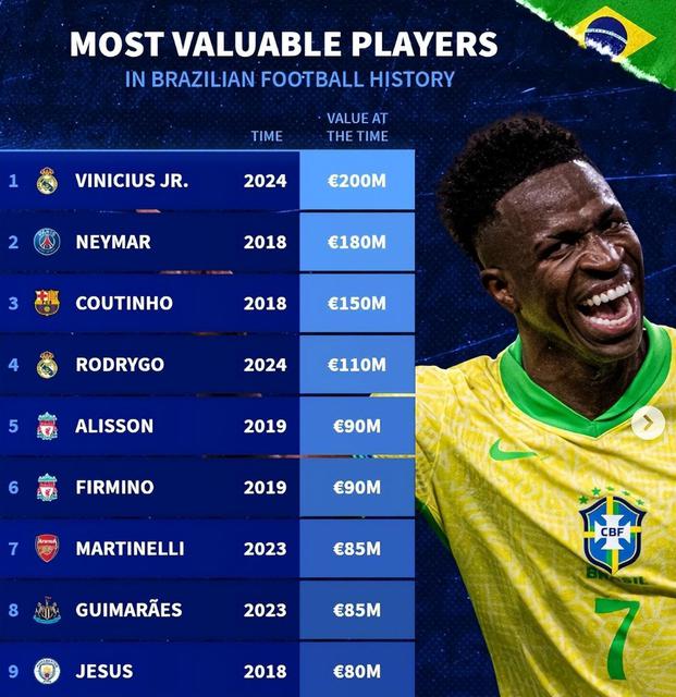 虽然这个赛季有姆巴佩加盟之后的竞争,但是维尼修斯仍然存在。 12 现场比赛交出 4 球 5 助攻的发挥;持续出色的发挥,维尼修斯身家上升到与哈兰德平起平坐也是有道理的。2 一亿欧元的维尼修斯也刷新了 3 记录:一、二 与哈兰德和哈兰德以及哈兰德以及哈兰德以及1亿欧元进入德转历史球员的最高身家名单。 2019 年姆巴佩并排。二是成为巴西历史上身价最高的球员;三是西甲迄今为止身价最高的球员。