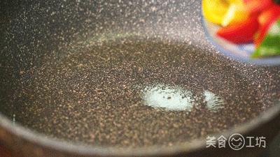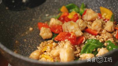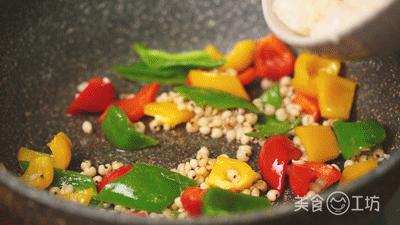 4. 加入彩椒和煮好的薏米一起翻炒。