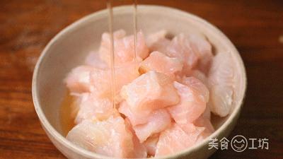 2. 加入龙利鱼块 1 个蛋清,5g 生粉,15g 米酒抓匀。
