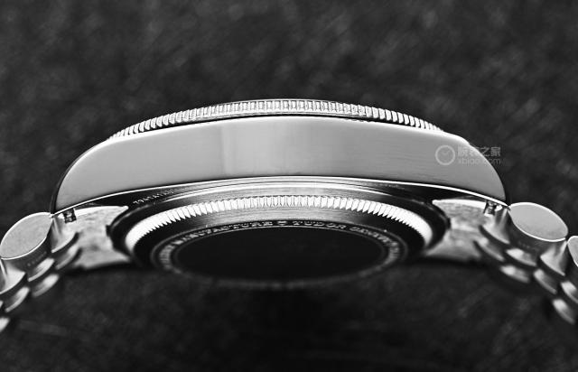 从手表正面看,表壳采用大规模拉丝工艺处理,但侧面经过大规模抛光工艺抛光,两种材料形成鲜明对比,更有层次感。