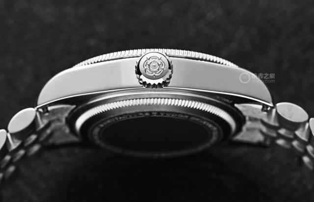 另一边,精钢手表周围设有防滑坑纹,方便佩戴者调整和抓取,进而调整时间。手表手柄采用浮雕工艺制作帝舵手表玫瑰,细节增加品牌认可度。