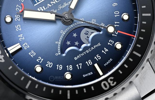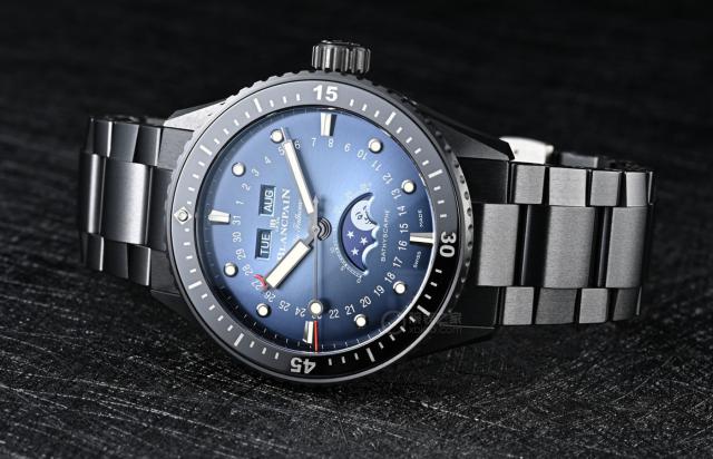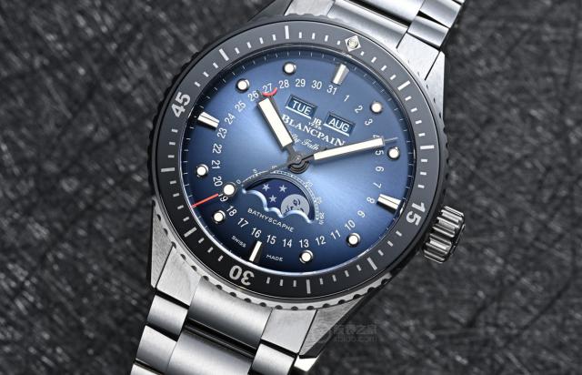 月相显示是“第二个宝珀” logo ",自然要与同样是现代专业潜水表的“鼻祖”五十?全历月相的加入,不仅让50深潜器的表盘看起来更加饱满,还让一款潜水表更加实用有趣,兼顾观赏价值,最终实现了运动与奢华的稳定平衡。此外,因为自动潜水和记时款都是 4 点位日历的原因,所以也使得深潜器全历月相有幸成为所有深潜器表款中表盘布局最对称的一款。虽然最新组合瓷表链的深潜器比同一组合帆布和 NATO 表带深潜器很贵 6 万多,但是我想说这个 6 超值万多贵!