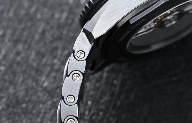 顶级陶瓷表壳的处理还是一样的,而对于全新的陶瓷表链来说,显然是一项更加艰巨的任务。大家都知道,打造一条设计精良、结构坚固的表链通常比制作表壳更加复杂。为保证理想的穿着舒适,宝珀进行了符合人体工程学的设计。这种瓷表链,共有 4 各种尺寸、结构各异的外链节,从表耳到表扣由宽到窄,线条流畅而浑然一体。这意味着除了每个表链都要独立制造之外,所有的链接都要经过手动边缘的倒角处理,以保证整个瓷器表链的形状要与表壳融为一体,触感和颜色要与表壳和手柄完全一致。最终,每一个链接都通过钛合金凸轮螺母连接起来,从而完成了这个顶级黑陶瓷表链独特的链接安装系统,就像“黑武士斗篷”一样。总而言之,这种复杂程度想想都觉得肝儿疼。这种表链不仅完美舒适,穿着舒适,易于打理,而且将新款深潜器的魅力值提升到了一个全新的维度!