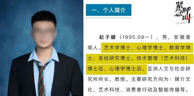 近日,内蒙古民族文化艺术研究所发布的95后研究员赵子健简历被怀疑翻车,引发舆论热议。简历显示,赵子健是四个不同方向的博士后,包括艺术、心理学和教育学。他还在20多个工业协会或社会团体兼职,横跨化工、防癌、航空、电子等多个领域。面临社会质疑,该研究所回应称,已经暂停了与赵子健的就业关系,并对其学历进行了审查。