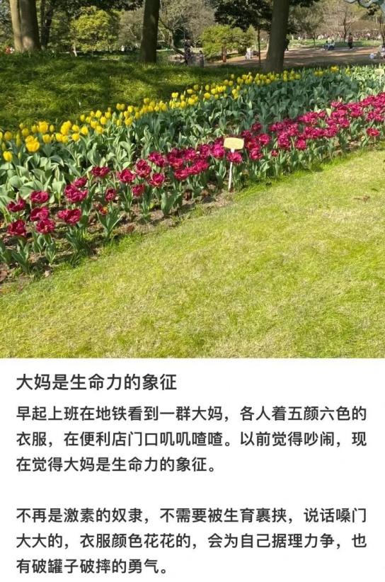 “和我一样,这位阿姨喜欢看直播表演,体验各种刺激的运动,主要是推动一个人变老但永远年轻。我以为人到中年会自动进入无聊的生活循环,每天只会照顾花草,遛狗,做饭,催促孩子结婚。但是认识她之后,我才真正意识到,只要心态不老,中年危机只是一朵云。”