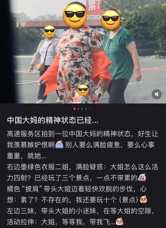 有人还发现,痞子大妈还是现在最有气血感的一群人。“年轻人每天坐在办公室里,总觉得自己气血不足,身心虚弱。所以他们会买很多营养补充剂哄自己,调侃自己老了肯定会被骗买保健品。痞子大妈可以轻松扛20斤大米上楼,永远不会被保健品忽悠,因为累了困了,就给自己煮一锅鸡汤。”
