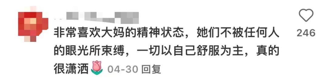 “因为痞女大妈最大的特点就是从来不取悦任何人,也不会为了寻求外界的认可而改变自己。所以他们对自己的身材和外表都没有焦虑,想吃什么就吃什么,别人怎么评价自己的外表也没关系。不管你爱上谁,你的态度都是‘大胆的爱,尽快分手’。即使每个人都不爱他们,他们也会爱自己。”